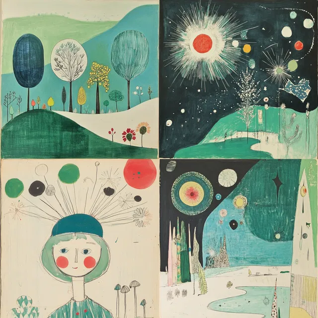 Этот стиль сочетает яркость с приглушённостью. Он гармонично соединяет причудливую абстракцию с влиянием модернизма, создавая игривый, но в то же время утончённый визуальный язык.