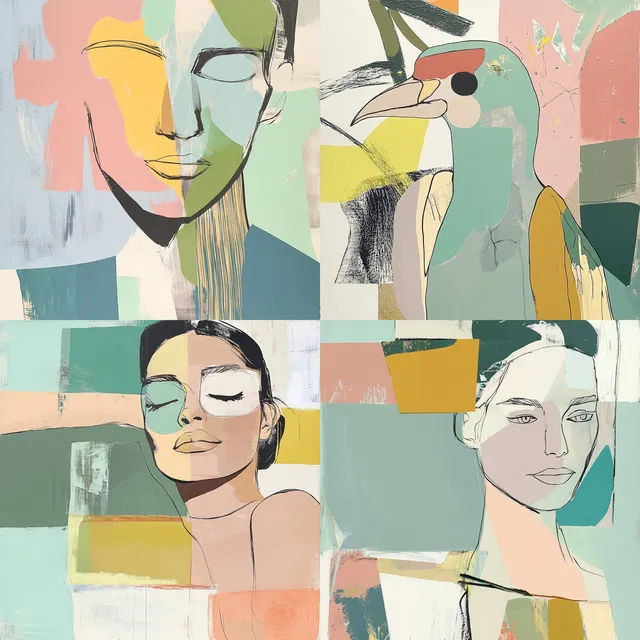 Этот стиль представляет собой поразительное сочетание абстрактных и геометрических элементов. Он создаёт гармоничное сочетание пастельных и приглушённых тонов. Композиции многослойные и фактурные, они предлагают тонкое, но смелое визуальное повествование.