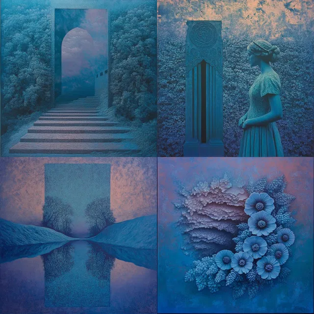Доминируют эфирные синие оттенки, которые создают сказочные, сюрреалистичные пейзажи и фигуры, вызывающие ощущение потустороннего исследования. Стиль отличается умением сочетать архитектурные формы с природными элементами, сохраняя мягкую, атмосферную окраску. Монохромная палитра усиливает настроение, но может ограничивать передачу ярких сцен.