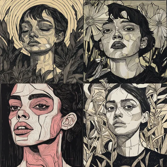 Этот стиль превосходно передаёт глубину повествования и исследование характера, что делает его идеальным для редакционной иллюстрации, модного дизайна и книжной графики. Однако использование чёрно-белых тонов может ограничить его применение в ситуациях, где требуются яркие цвета.