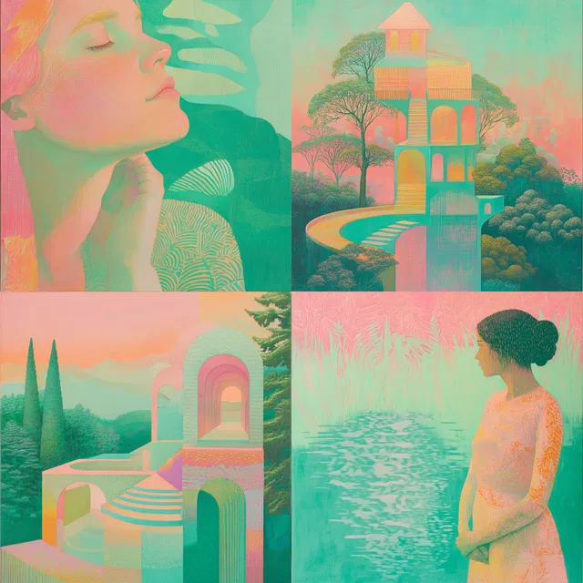Пастельные сны (Pastel Dreamscapes) — это безмятежный и воздушный визуальный язык, который характеризуется мягкими тонами и гармоничным балансом. В этом стиле прекрасно получается создавать сказочную атмосферу с помощью нежных текстур и органических форм, напоминающих импрессионизм и модерн. Плавные линии и тонкие градиенты вызывают ощущение спокойствия и причудливости, что делает его идеальным для использования в редакционном дизайне, моде и брендинге.