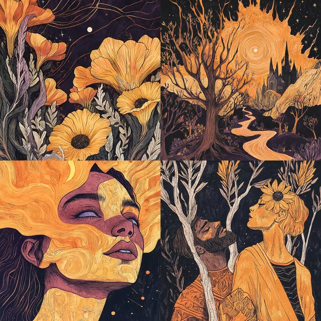 Объекты часто переплетаются с природой, включая цветочные мотивы и ботанические элементы, которые гармонично вписываются в композицию. Стиль прекрасно передаёт сказочную атмосферу благодаря эфирному освещению и выразительным взглядам, которые погружают зрителя в зачарованный мир.