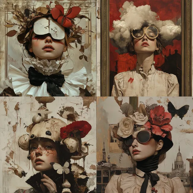 Этот стиль сочетает в себе исторические мотивы и сказочные композиции, создавая насыщенную картину для визуального повествования. Его приглушённая палитра и замысловатые детали вызывают чувство ностальгии, а символичные образы и причудливые персонажи приглашают зрителей в мир фантазий и аллегорий.