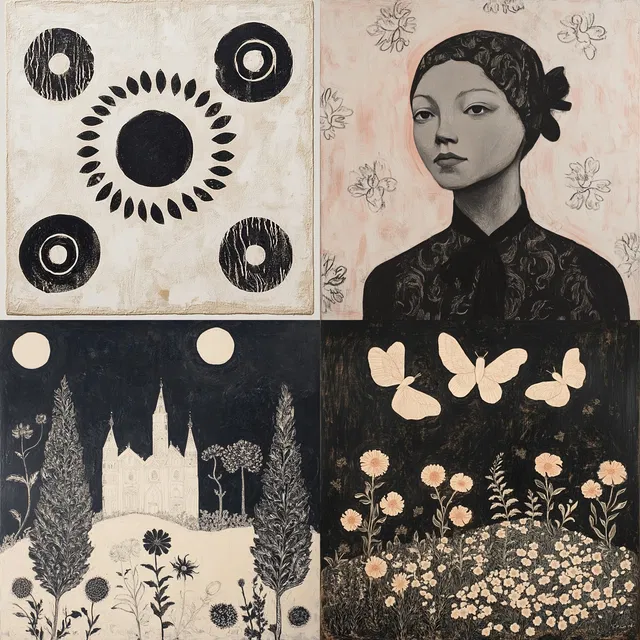Отличительный стиль, который характеризуется богатством текстур и многослойностью композиций, предлагает гармоничное сочетание традиционной и современной эстетики. Использование монохромных тонов и оттенков сепии создаёт винтажную, но вневременную привлекательность, а сложные детали и изящные линии добавляют глубину и нюансы.