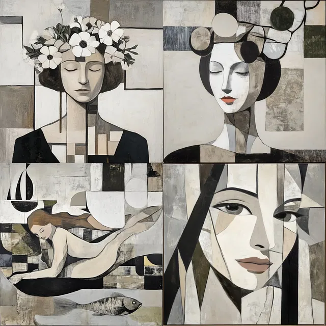 Этот стиль — поразительный пример геометрической абстракции. Он глубоко укоренён в кубистических влияниях и характеризуется угловатыми формами и монохромной палитрой. Композиции многослойны и структурированы, что создаёт ощущение глубины и сложности за счёт наложения элементов.