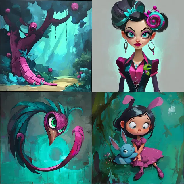 Яркая цветовая палитра и причудливые персонажи определяют этот стиль, создавая игривую и сказочную атмосферу. Сюрреалистические пейзажи и преувеличенные черты способствуют созданию фантастического повествования, напоминающего анимацию и иллюстрации из книг. Постоянное использование неоновых и пастельных тонов усиливает живое и энергичное настроение, а сложные детали и плавные градиенты добавляют глубины.