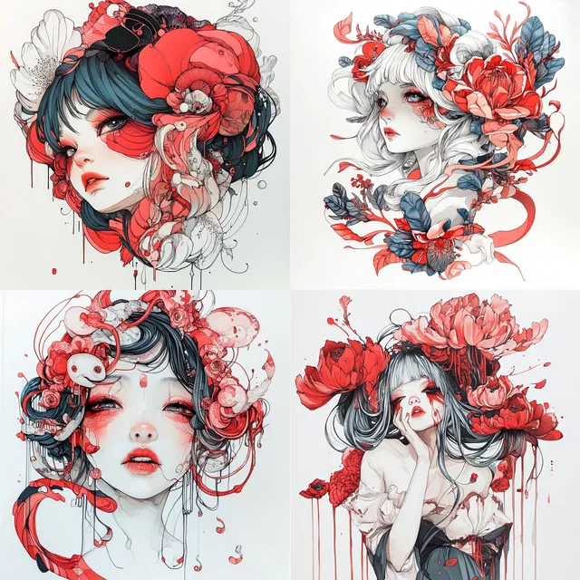 Этот стиль отличается яркой выразительностью и замысловатыми деталями. В нём переплетаются влияние модерна и современная японская эстетика. Преобладает красно-чёрно-белая палитра, которая позволяет создавать динамичные композиции, сочетающие органические формы с чёткими линиями.
