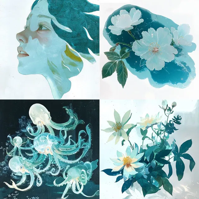 Аква-дримскейп очаровывает своей неземной смесью акварельных текстур и плавных форм, создавая сказочную атмосферу, одновременно безмятежную и выразительную. Использование в этом стиле бирюзовых оттенков и мягкого освещения наполняет каждое изображение нежным контрастом и гармоничной палитрой, вызывая чувство спокойствия и самоанализа. Органичные формы и многослойные текстуры способствуют созданию причудливой и поэтичной эстетики, напоминающей импрессионизм и модерн.