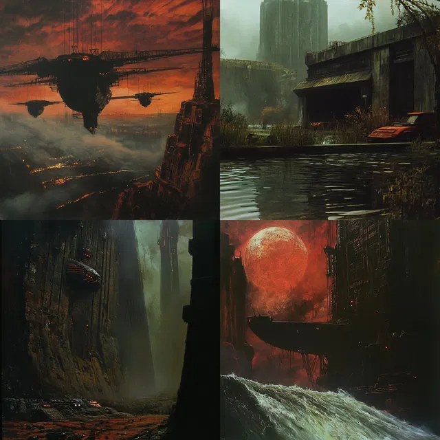 В дистопических атмосферах преобладают мрачные нарративы, сотканные из приглушённых тонов и землистых оттенков. Характерны текстурная насыщенность и глубина атмосферы, которые создают кинематографичность и погружают зрителей в мрачные футуристические пейзажи.