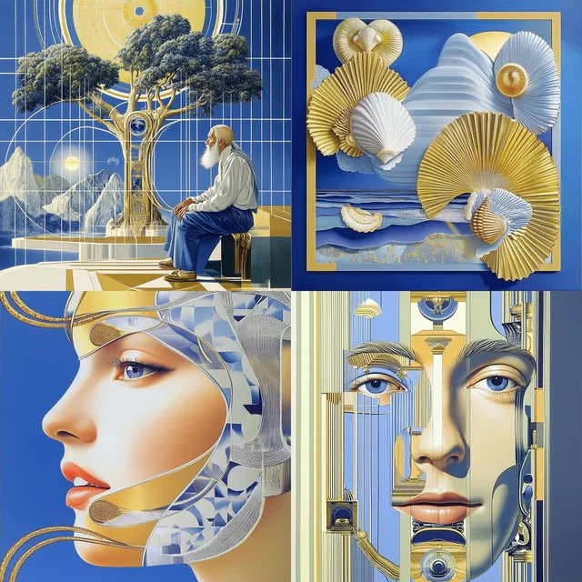 Насыщенные цвета, преимущественно синий и золотой, создают ощущение безмятежного спокойствия в самых разных сюжетах: от архитектурных чудес до мифологических повествований.