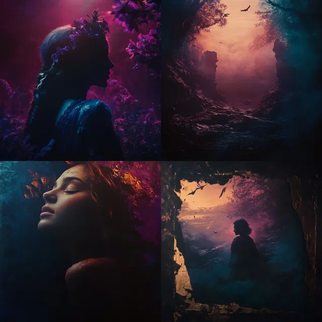 Преобладают насыщенные, яркие цветовые палитры, которые создают атмосферу загадочности. Стиль отличается мастерским использованием светотени, что придаёт композициям драматизм и барочную выразительность. Замысловатые детали и многослойные текстуры усиливают визуальную глубину, а силуэты и тени вызывают ощущение тайны и заставляют задуматься.