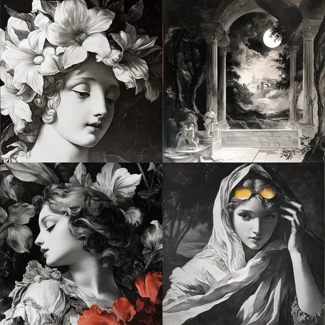 Элегантность в стиле «барокко-нуар» очаровывает своей замысловатой детализацией и драматическим контрастом света и тени, вызывая ощущение вневременной красоты и исторического величия. Богатые композиции этого стиля и монохромная палитра создают театральную атмосферу, напоминающую искусство барокко и рококо. Хотя его сила заключается в передаче романтических и мифических тем, ему может быть сложно справиться с фотореализмом и современным минимализмом.