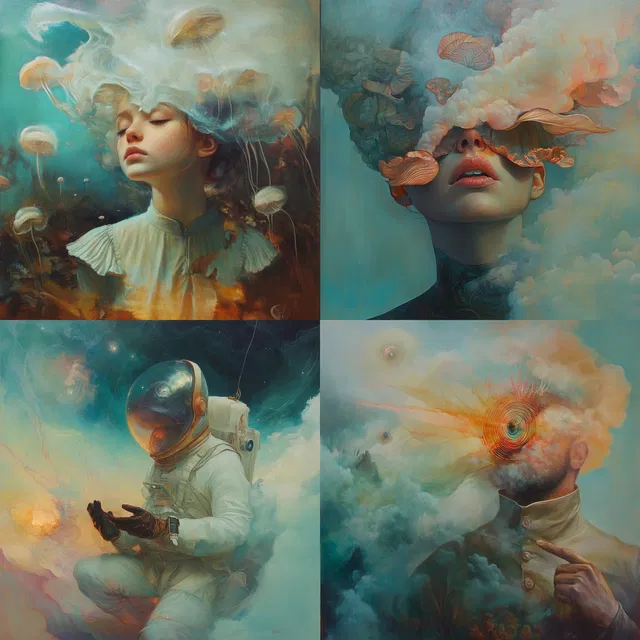 Этот стиль завораживает своей сказочностью и сюрреализмом. Он пленяет своей неземной атмосферой и причудливыми сюжетами. В нём отлично получается создавать сцены, словно из другого мира, с помощью мягких, приглушённых цветовых палитр и сложных, многослойных композиций.