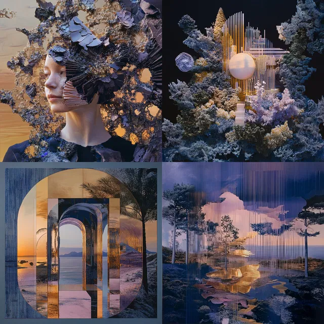 Текстурная сложность и многослойность определяют этот стиль, объединяя сюрреалистическую абстракцию с образами из снов. Металлический блеск и отражающие поверхности сочетаются с приглушёнными золотистыми и нежными голубыми тонами, создавая неземную атмосферу. Биоморфные структуры и органические формы вызывают в воображении футуристические пейзажи и темы, связанные с заботой об экологии, а скандинавские мотивы и мифические элементы обогащают визуальную историю.