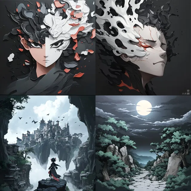 Этот стиль отличается сложной детализацией и многослойными композициями, в которых традиционные японские мотивы сочетаются с современной эстетикой. Использование монохромной и серой палитры создаёт спокойную, но загадочную атмосферу. Динамичные позы и выразительные взгляды придают глубину образам персонажей.