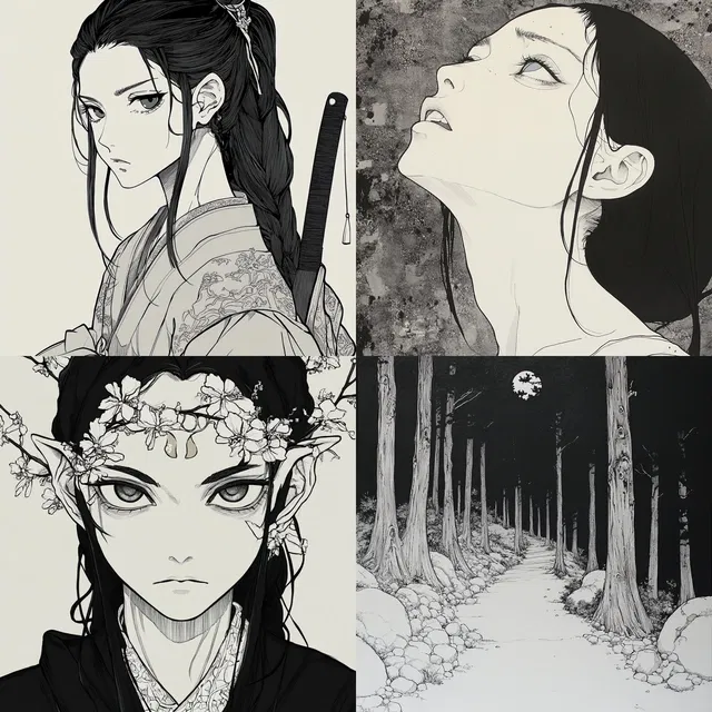Этот стиль отличается поразительным сочетанием сложных линейных рисунков и монохромной эстетики. Здесь преобладают детальные иллюстрации и тщательно продуманные композиции. Стиль отлично подходит для создания динамичных поз и выразительных лиц, особенно под влиянием манги и аниме, сохраняя при этом единую чёрно-белую тему.