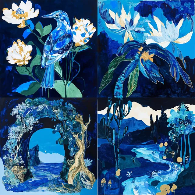 Этот стиль отличается яркой выразительностью. Он очаровывает динамичной манерой письма и насыщенными текстурами, создавая полотно из глубоких синих оттенков и позолоченных акцентов.