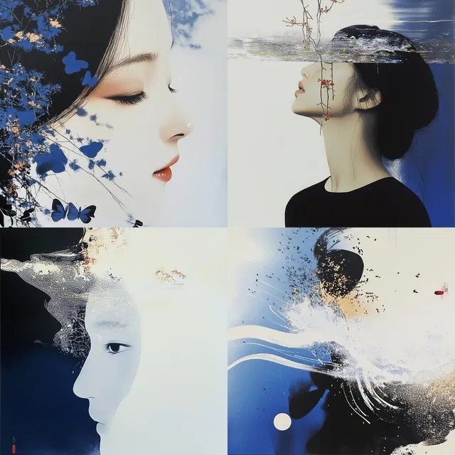Воздушные композиции сочетают в себе сказочную атмосферу и плавные формы, подчёркивая минималистичный стиль, в котором преобладают холодные синие тона. Мягкие градиенты и тонкие контрасты создают безмятежное, мистическое настроение в самых разных сюжетах: от футуристических городских пейзажей до традиционных корейских мотивов.