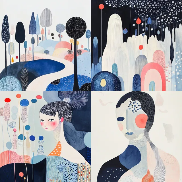 Этот стиль пленяет своей воздушной и сказочной атмосферой. Его отличает причудливая абстракция и спокойная цветовая палитра. Мягкие оттенки синего и нежно-розового создают умиротворяющую атмосферу, а игривые точки и плавные органические линии придают ритмичность.