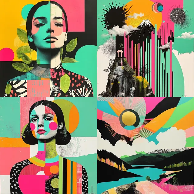 Доминируют смелые контрасты и яркие цвета, создавая энергичную и живую эстетику. В этом стиле прекрасно сочетаются наслоение текстур и геометрические узоры, напоминающие влияние поп-арта и оп-арта. Его игривая абстракция и динамичные композиции делают его идеальным для редакционного дизайна и модной иллюстрации. Однако сильная зависимость стиля от графических элементов может снизить его эффективность в фотореалистичных контекстах. Он лучше всего подходит для современных городских применений и процветает в областях, где требуются смелые визуальные решения.