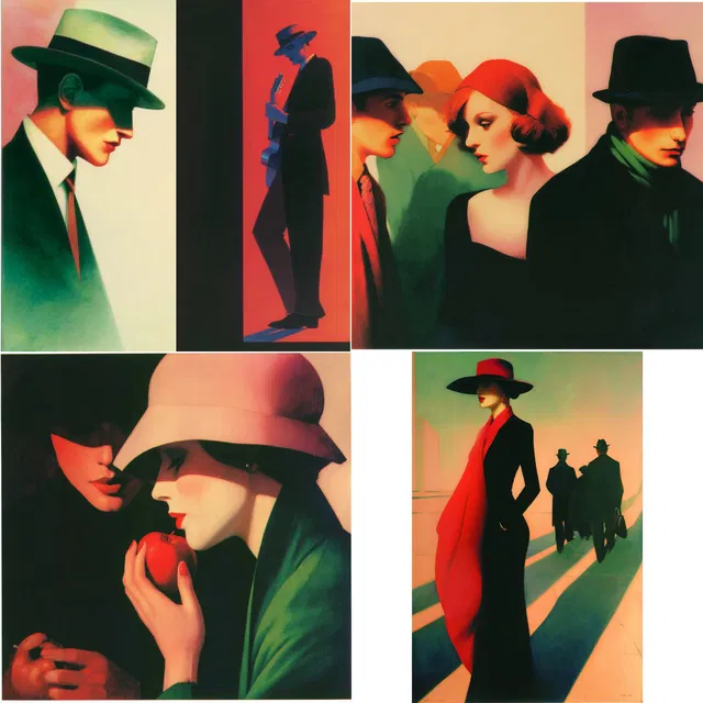 Контрасты ярких цветов и драматичное освещение — ключевые черты этого стиля, создающие выразительное взаимодействие тени и света. Использование геометрических форм и стилизованных фигур рождает ощущение современности и ностальгии, напоминая об ар-деко и сюрреализме.
