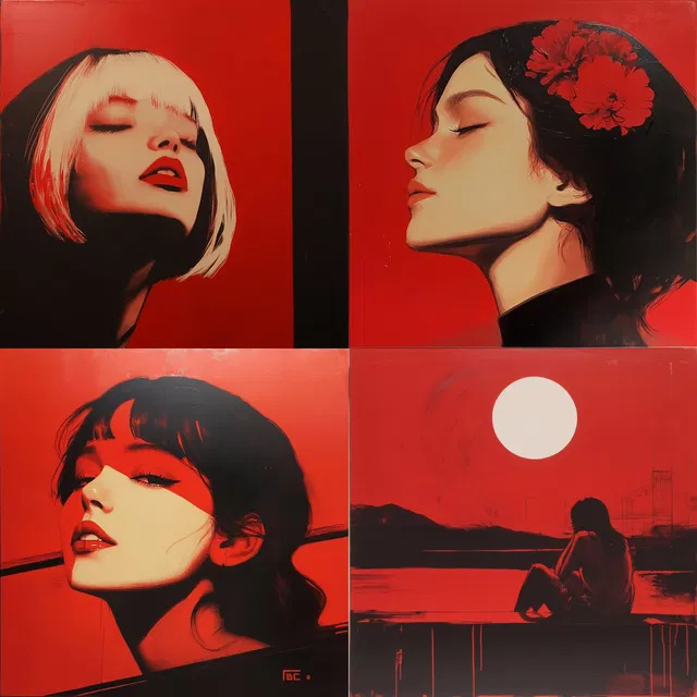 Смелое использование красного и чёрного цветов создаёт яркий визуальный язык, подчёркивая контраст и драматизм в различных темах. Стиль отличается минималистичной абстракцией, используя геометрические формы и отражающие поверхности, чтобы передать ощущение современности и изысканности.