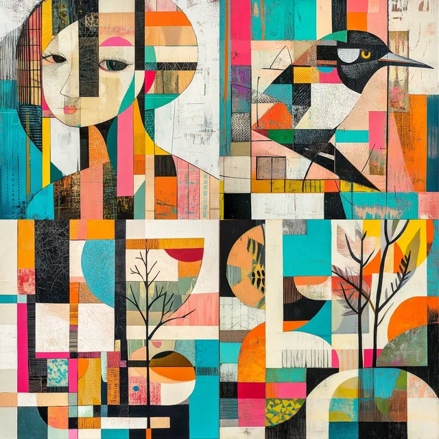 Доминирует яркая геометрическая абстракция, создавая динамичные композиции с многослойными текстурами и смелыми контрастами. Этот стиль привлекает внимание абстрактными формами и геометрическими узорами, формируя игривую, но изысканную эстетику, напоминающую модернистские течения, такие как конструктивизм и де Стейл.
