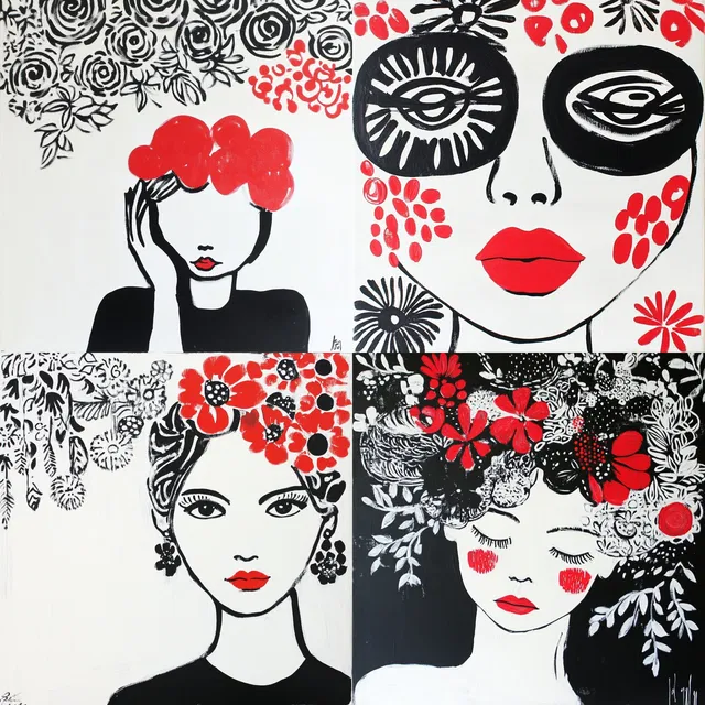 В этом стиле преобладает яркая чёрно-белая палитра с яркими красными акцентами. Он отлично подходит для создания высококонтрастных графических композиций. Часто встречаются цветочные и ботанические мотивы, которые придают визуалам игривый и причудливый характер.