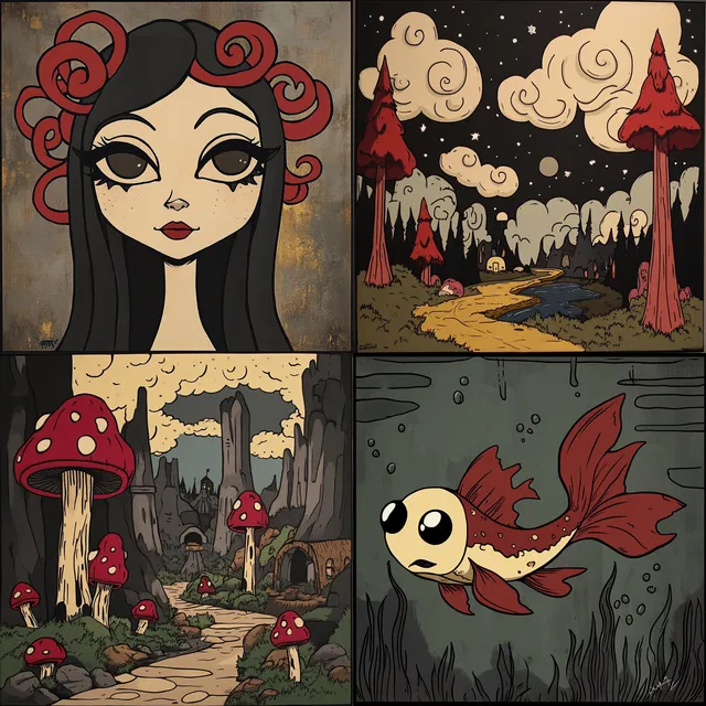 В этом стиле преобладают чёткие контуры и плоские цвета, что создаёт причудливую мультяшную эстетику, напоминающую поп-арт и комиксы. Упрощённые формы и резкие контрасты придают изображению игривость и сюрреалистичность, а приглушённые земляные тона обеспечивают теплоту и гармонию.