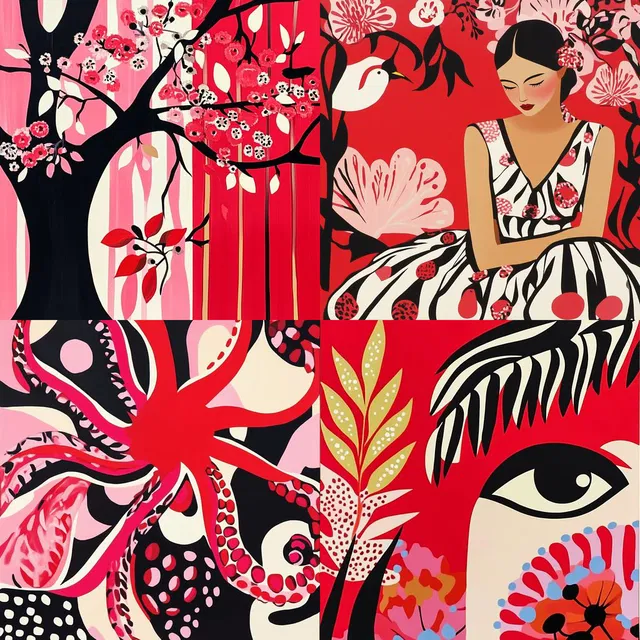В стиле Vivid Graphic Fusion используется смелая цветовая палитра, в которой преобладают красный, розовый и чёрный цвета, что создаёт яркое визуальное впечатление. Графические линии и чётко очерченные края придают современный, поп-арт-стиль, а цветочные и ботанические мотивы добавляют нотку природной элегантности.