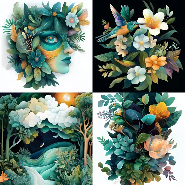 Здесь преобладают яркие растительные мотивы, которые сплетают замысловатые органические формы с многослойными текстурами и землистыми тонами. Стиль отличается умением гармонично сочетать элементы, вдохновлённые природой, и создаёт безмятежную и спокойную атмосферу. Он прекрасно справляется с детализированной прорисовкой и гармоничными композициями, но в некоторых контекстах может испытывать трудности с фотореализмом. Этот стиль идеально подходит для книжной иллюстрации, модного дизайна и брендинга. Он красиво передаёт суть природы через призму современности.