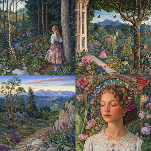 Этот замысловатый и богато украшенный стиль очаровывает своими насыщенными растительными мотивами и тщательно проработанными деталями, напоминая романтизм ар-нуво и прерафаэлитов. Яркая и сочная цветовая палитра усиливает сказочную и причудливую атмосферу.