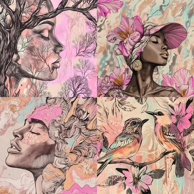 Этот стиль характеризуется воздушностью и сказочной атмосферой. Его отличают изящные детали и мягкая цветовая палитра. Ботанические мотивы и органические формы создают безмятежную атмосферу, напоминающую модерн и романтизм. Пастельные тона и нежные текстуры усиливают воздушную эстетику, что делает стиль идеальным для модной иллюстрации, редакционного дизайна и брендинга. Хотя он прекрасно подходит для создания спокойных и гармоничных визуалов, ему может не хватать точности, необходимой для технических или фотореалистичных приложений.