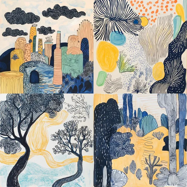 Динамичные контуры и яркие палитры преобладают в этом стиле. Выразительные линии и игривые композиции создают причудливую атмосферу. Органичные узоры и ботанические мотивы указывают на глубокую связь с природой, а смелые контуры и чёткие линии подчёркивают структуру.