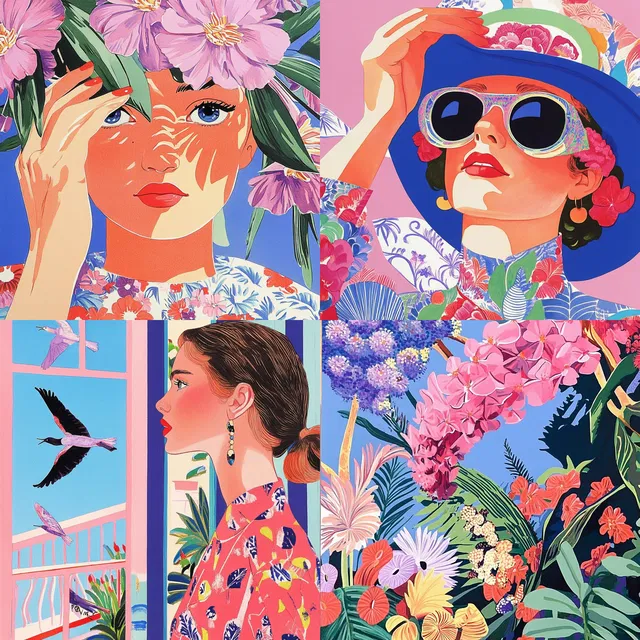 Эта эстетика отличается яркой палитрой и смелыми композициями, в которых поп-арт сочетается с современными тенденциями. Динамичные макеты и игривые формы создают радостное визуальное впечатление, а цветочные и ботанические мотивы добавляют нотку элегантности, вдохновлённой природой.