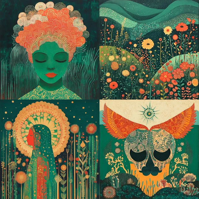 Этот стиль отличается яркостью и замысловатостью. Он объединяет элегантность модерна с фольклорной причудливостью, создавая пышный ковёр из ботанических мотивов и эфемерных фигур. Использование насыщенных, землистых тонов и сложных узоров вызывает атмосферу мечты, напоминающую о Gustav Klimt и Alphonse Mucha.