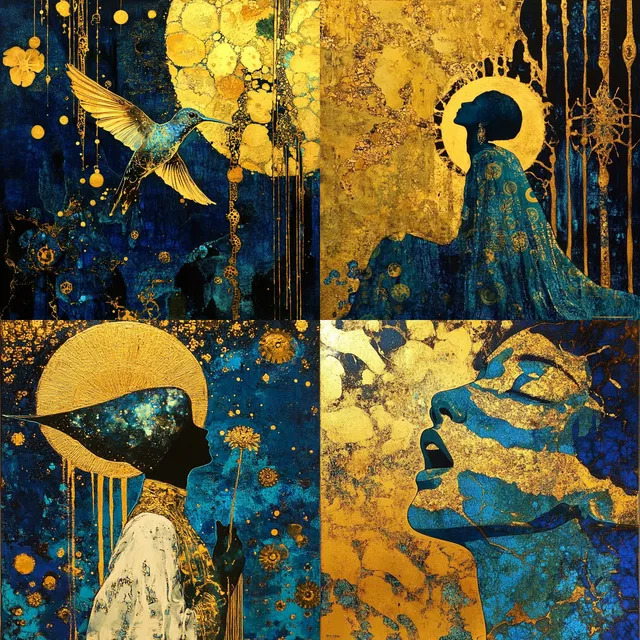 Основу цветовой палитры составляют золото и синий цвет, придающие каждому элементу царственность и эфемерность. Композиции многослойные и сложные, часто с изысканными узорами и декоративными элементами, которые вызывают ощущение величия и мистики.