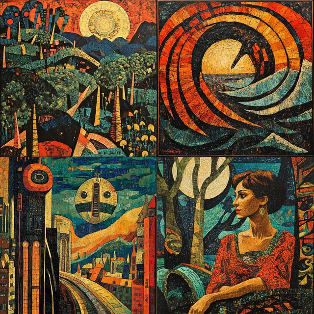 Доминируют яркие мозаичные текстуры, создающие динамичное взаимодействие геометрических узоров и мозаичных поверхностей. Этот стиль перекликается с замысловатыми деталями в духе византийского искусства и ар-нуво, а живая палитра цветов наполняет энергией каждый элемент.