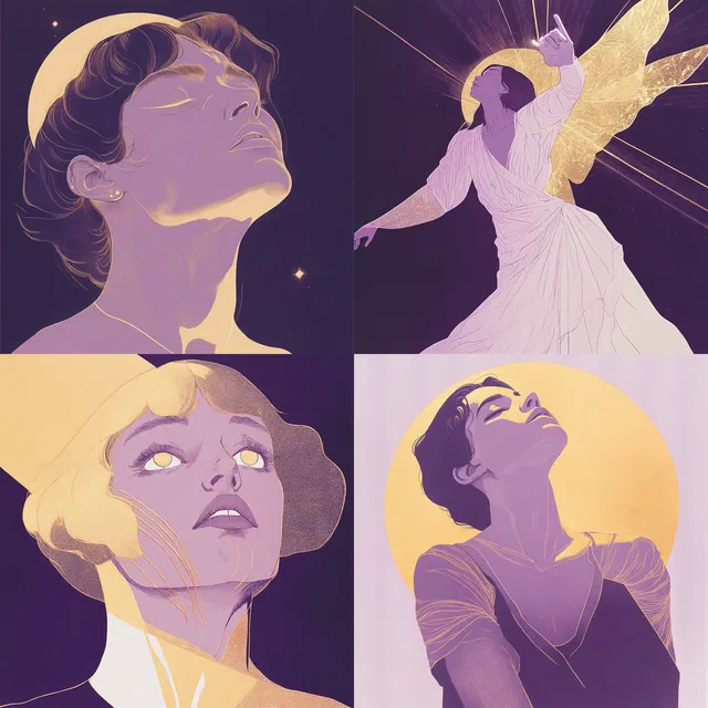 Этот стиль отличается ярким сочетанием золотых и фиолетовых оттенков, что создаёт ощущение неземной элегантности и небесного величия. Использование сложной линейной графики и детального орнамента напоминает роскошь влияний византийского искусства и ар-нуво, создавая визуальную историю, одновременно мистическую и сказочную.