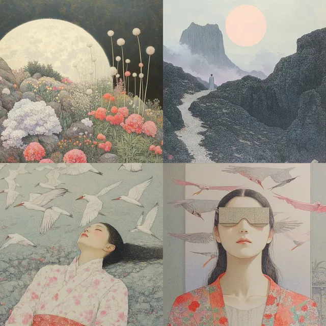 Доминируют воздушные пейзажи и изящные композиции, выполненные в мягких пастельных тонах с туманным фоном. Этот стиль отлично передаёт японскую эстетику, сочетая традиционные элементы с современными интерпретациями. Изящные линии и тонкая цветовая палитра создают текстурное богатство, которое вызывает атмосферу мечты.