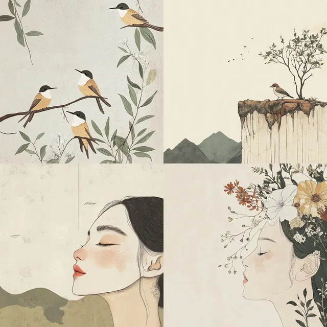 Этот стиль отличается воздушностью и спокойствием. Он изящно сплетает природные элементы с человеческими, создавая умиротворяющее визуальное повествование. Приглушённая палитра и изящные линии вызывают чувство спокойствия и равновесия, напоминая об искусстве модерна и символизме.