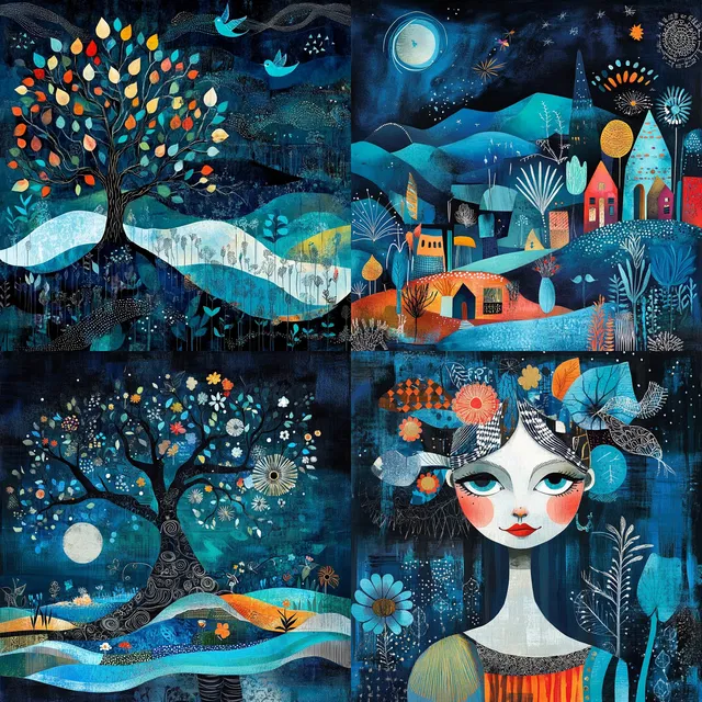 Для этого стиля характерно яркое сочетание цвета и формы. Преобладающая синяя палитра дополнена бирюзовыми и оранжевыми акцентами. Композиции сложны и многослойны, с различными текстурами и замысловатыми узорами, которые создают атмосферу, напоминающую сон.