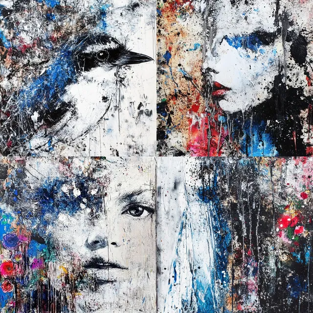 Преимущественно монохромная цветовая палитра с синими акцентами усиливает ощущение тревоги, подчёркивая изношенные текстуры и хаотичные брызги.