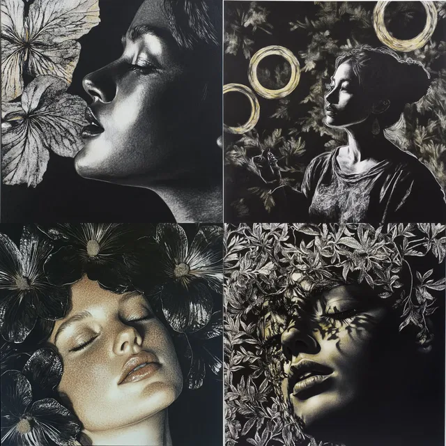 Этот стиль отличает сложная детализация и утончённая монохромная палитра с любовью к цветочным мотивам и ботаническим темам. Игра света и тени создаёт эффект драматического светотени, усиливая воздушную и мистическую атмосферу. Отражающие поверхности и металлический блеск добавляют роскошный штрих, а влияние стилей модерн и символизм проявляется в плавных линиях и органических изгибах.