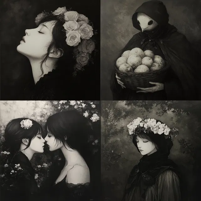 Мастерство игры света и тени определяет этот стиль, создавая сказочную атмосферу и неземную красоту. Монохромные палитры и тонкие контрасты рождают поэтическое и меланхоличное настроение в самых разных темах — от готической архитектуры до загадочных персонажей. Замысловатые детали и богатство текстур усиливают глубину повествования, вызывая ассоциации с викторианской эпохой и романтизмом.