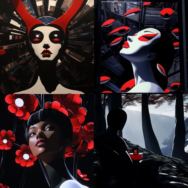 Поразительный визуальный стиль, который отличается смелым использованием монохрома с красными акцентами, создавая высококонтрастную футуристическую эстетику. В этом стиле прекрасно передана геометрическая точность и гладкие, отражающие текстуры. Часто используется светотеневая техника освещения для усиления драматического напряжения.