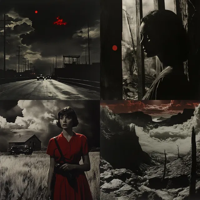 Этот стиль отличается ярким взаимодействием светотени и эстетики нуара. Он создаёт ткань из драматических контрастов и атмосферной глубины. Преобладают монохромные палитры, которые подчёркиваются яркими красными акцентами, добавляющими интриги и напряжения.