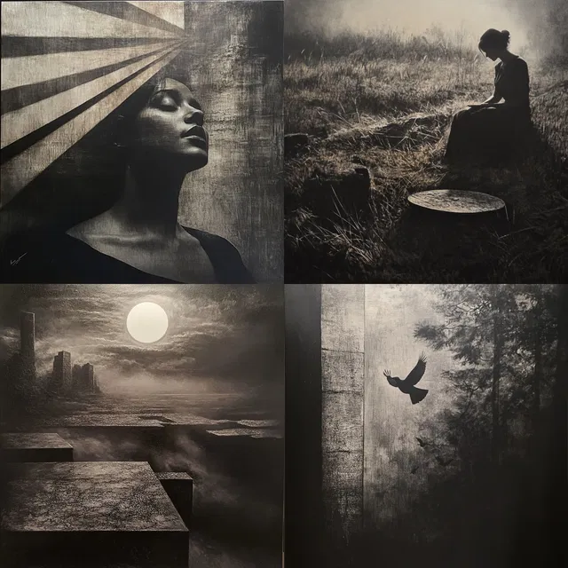 Этот стиль — яркое воплощение монохромной элегантности и атмосферной глубины. В нём мастерски используются техники кьяроскуро, чтобы создать мрачное, интроспективное настроение. Основное внимание уделяется игре теней и богатству текстур. Композиции насыщены тонкими градиентами и мягкими контрастами, что вызывает ощущение спокойной напряжённости и меланхоличной интроспекции.