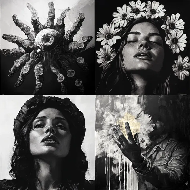 Выразительная манера письма и динамичные мазки определяют этот стиль, создавая фактурные поверхности и насыщенные детали на монохромной палитре.
