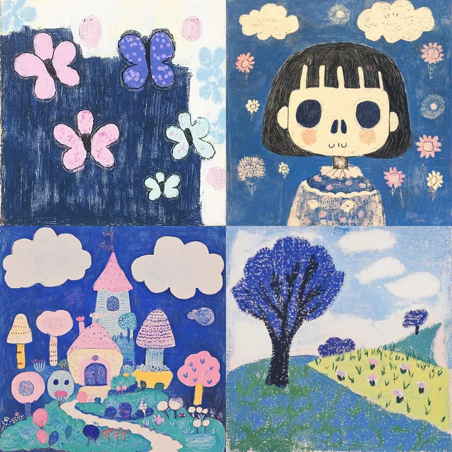 Этот стиль вызывает ощущение невинности и фантазии, часто включая элементы природы, фэнтези и науки. Его иллюстративное качество напоминает народное и наивное искусство, с акцентом на простоте и выразительности.